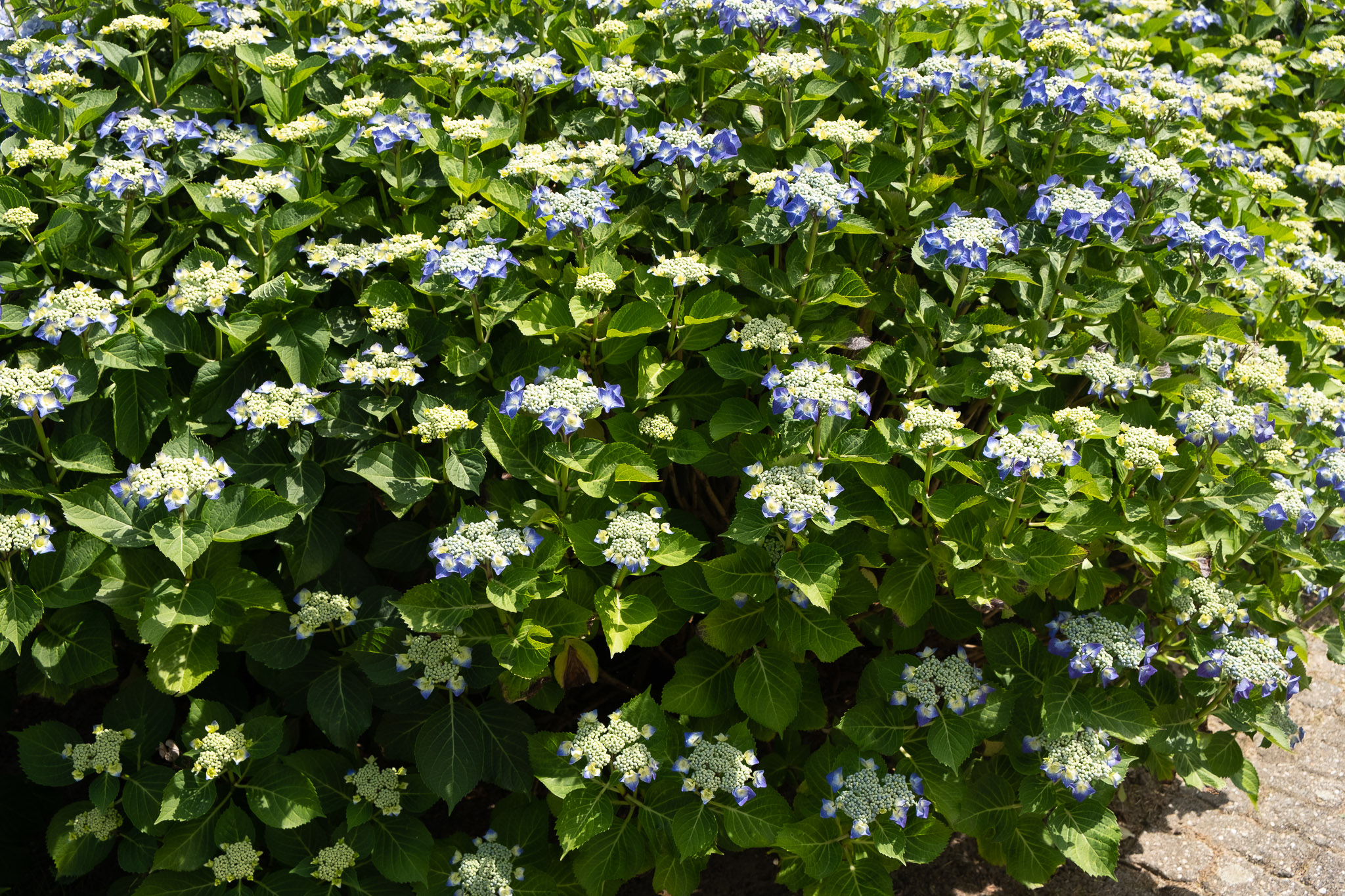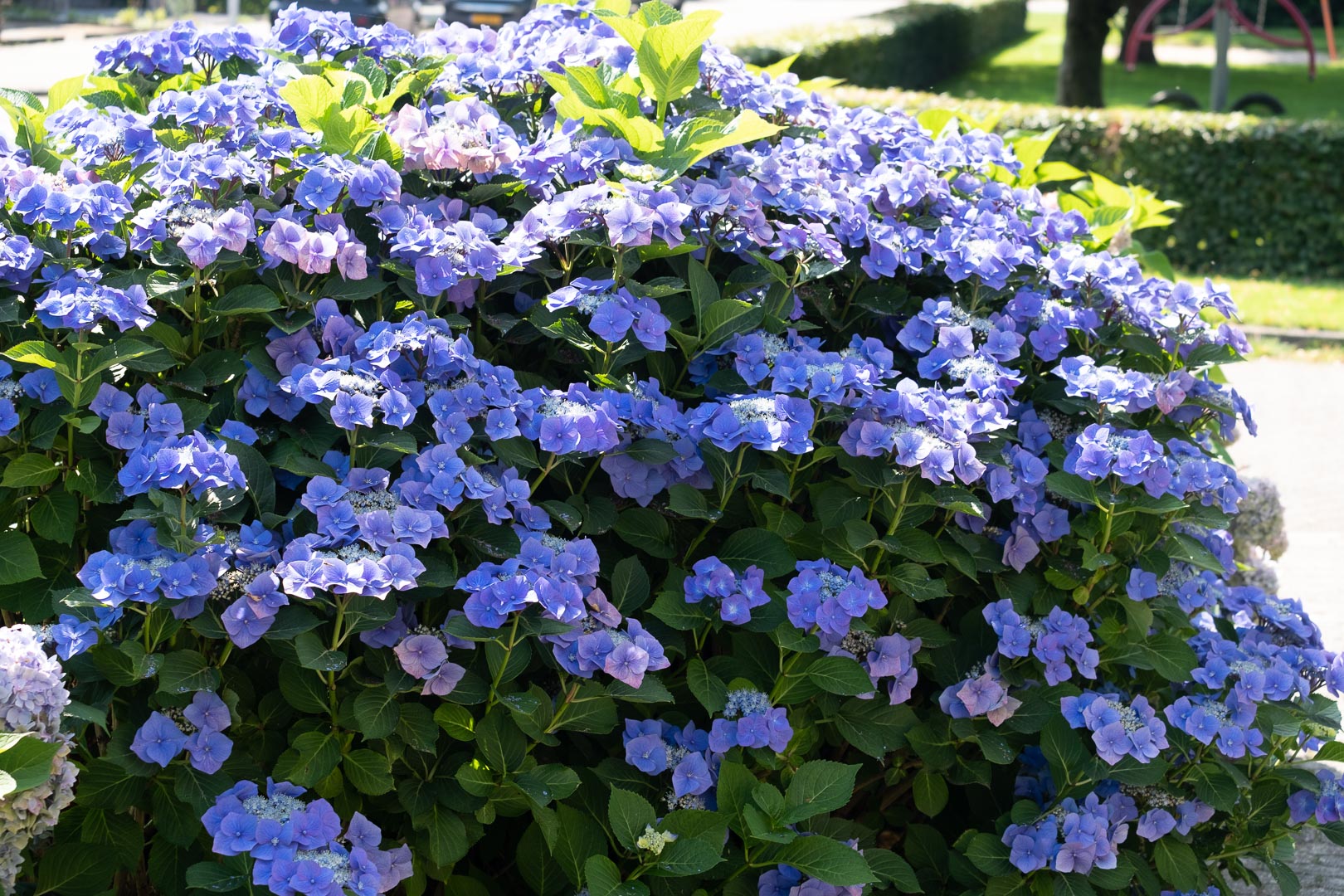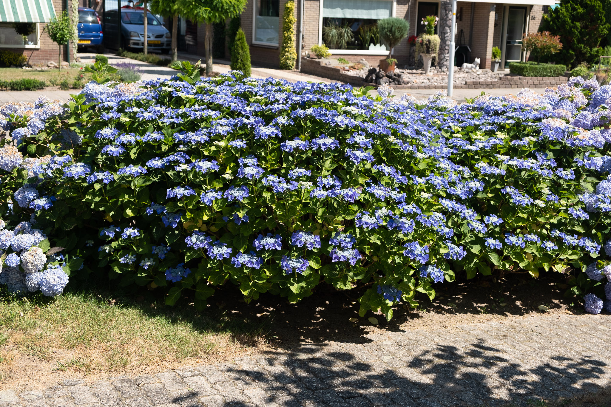 Met blauwe scherm op de hoek van de tuin Tuinstraat-Marjoleinstraat. Wordt om het jaar in maart tot op ca 15cm gesnoeid met de heggenschaar. In het andere jaar worden de oude bloemen verwijderd.Informatie